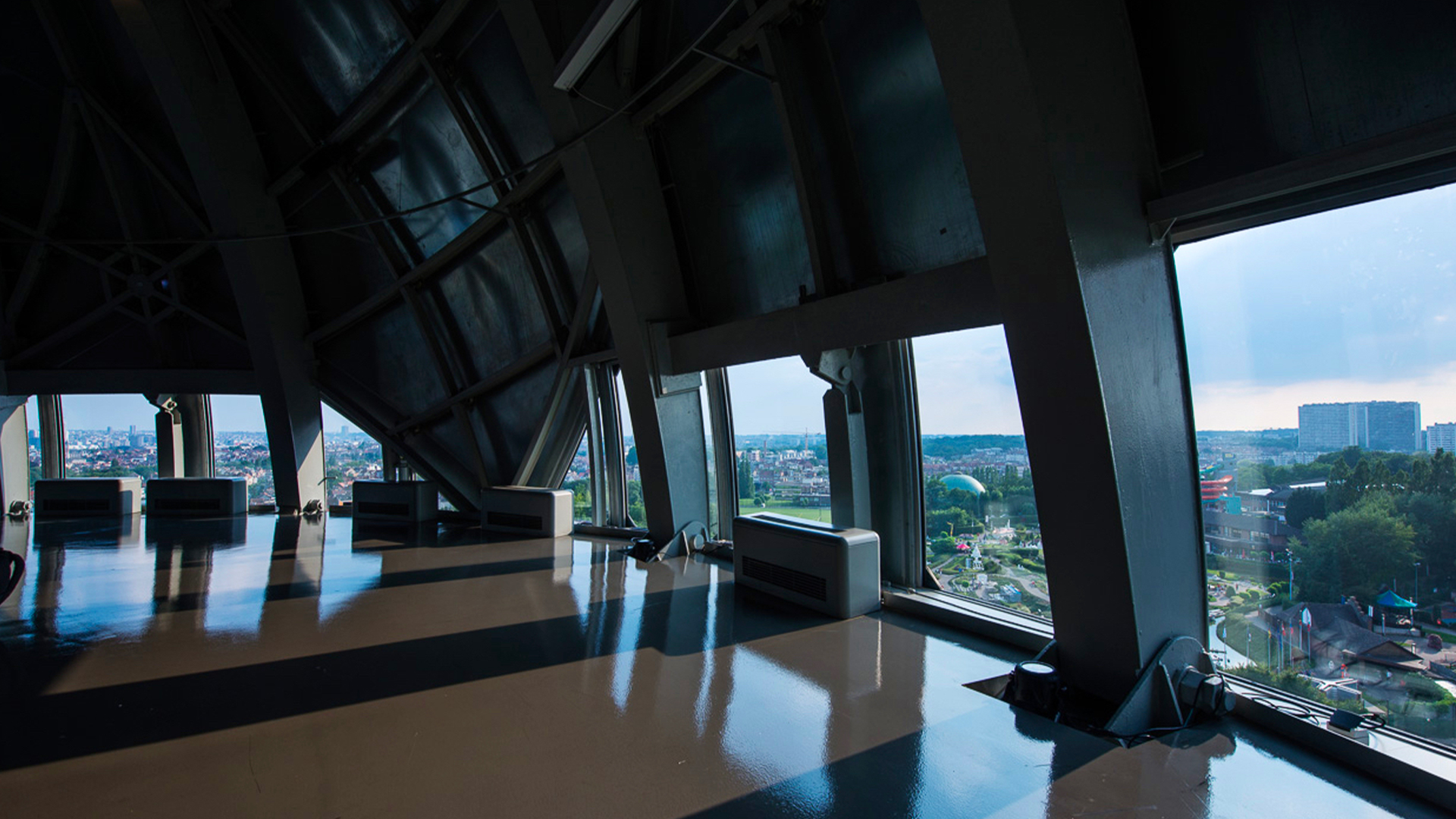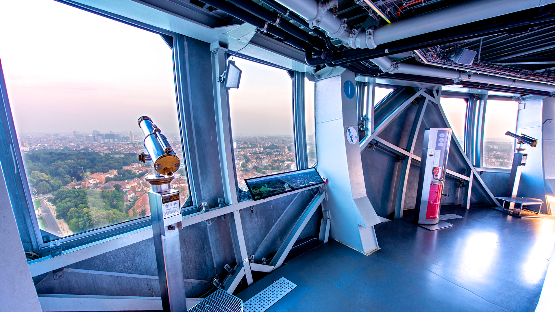 Inox-Kuppeln mit einem Durchmesser von 18 Metern, die von einem eindrucksvollen Tragwerk zusammengehalten werden • die schönste Panorama-Aussicht auf die Stadt Brüssel • eine zeitgenössische Beleuchtung, eigens für das Atomium entworfen und realisiert von dem berühmten Lichtdesigner Ingo Maurer • Zugang zu den Ausstellungen des Atomiums